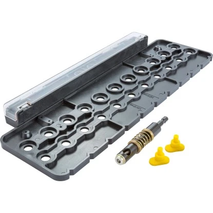 Die Bohrschablone für Schränke erlaubt es, eine Lochreihe mit bis zu 11 Bohrungen exakt einzuzeichnen. Gedacht für Arbeiten an Schränken, bei denen klassische Möbelbänder als Verbindungsbeschläge infrage kommen. Ob Topfscharnier oder Möbelbänder: Empfehlenswert ist, mit der Bohrarbeit am Korpus des geplanten Schranks zu beginnen. Im Anschluss legen Sie die Tür gekontert an und zeichnen mithilfe der Bohrschablone die Gegenlöcher oder den Mittelpunkt für die Topfbohrung ein. Das praktische Zubehör im Set erweist sich dabei als zuverlässiger Helfer. Mit dem hochwertigen Zubehör bringen Sie Scharniere präzise sitzend als verbindende Beschläge an den Werkstücken an.